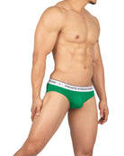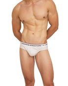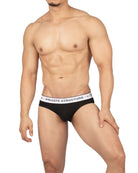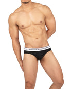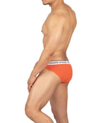前閉じ仕様のローライズブリーフ ( ミニブリーフ ) 。細いウエストゴムにロゴを施したシャープなデザイン。前閉じ仕様のビキニモデルボディ。シンプルながらにウエストベルトの赤いラインなどこだわりのディテールです。