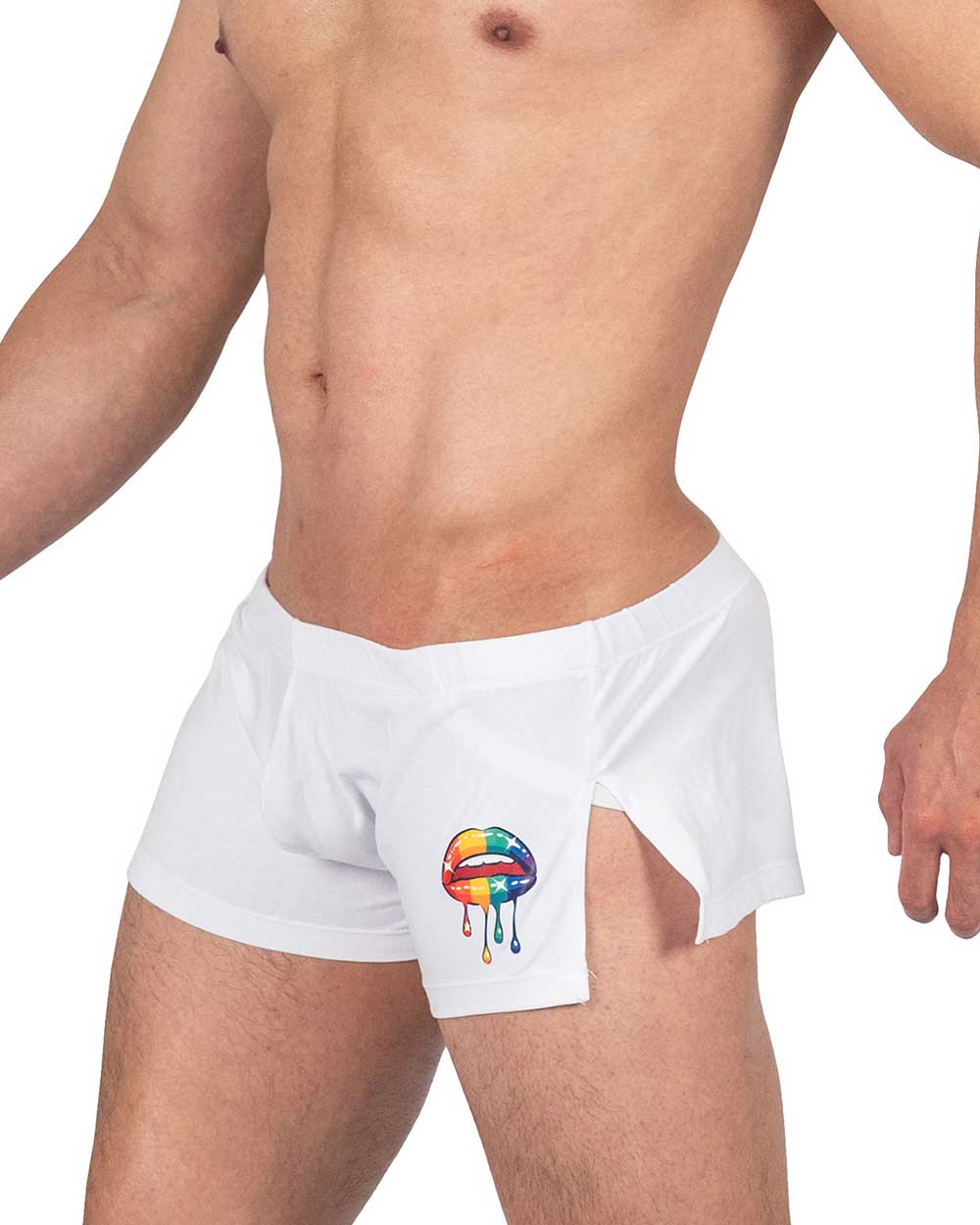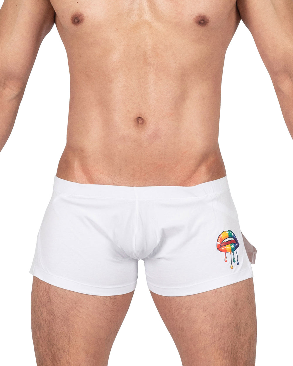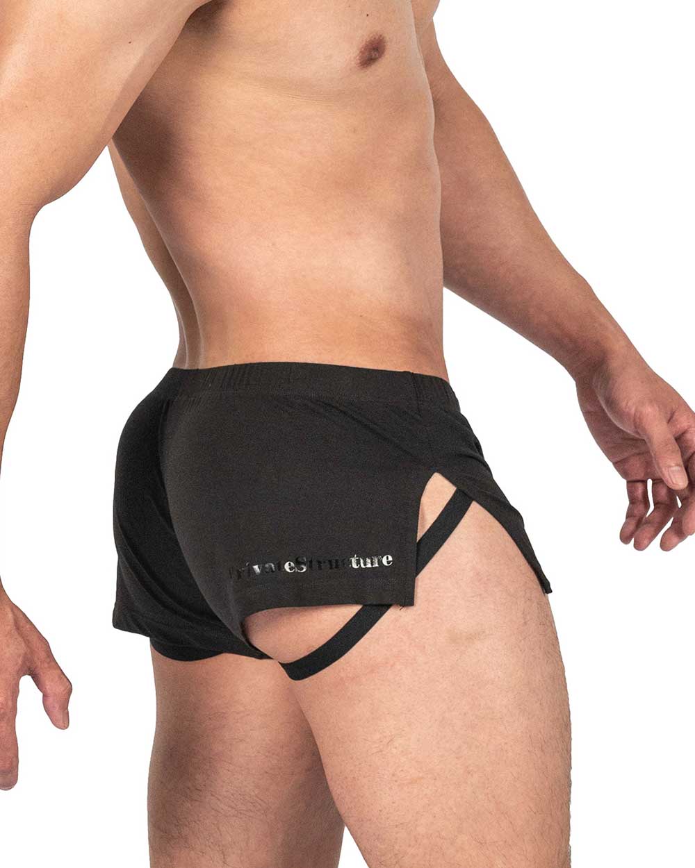 プライベートストラクチャーの限定コレクションLoad My Mouth。オリジナルプリントをとりれたPOPでキャッチーなデザイン。大きくスリットの入った両サイドからはジョックストラップが覗きます。開放的なデザインと相まって蒸れなく快適に着用いただける一枚です。